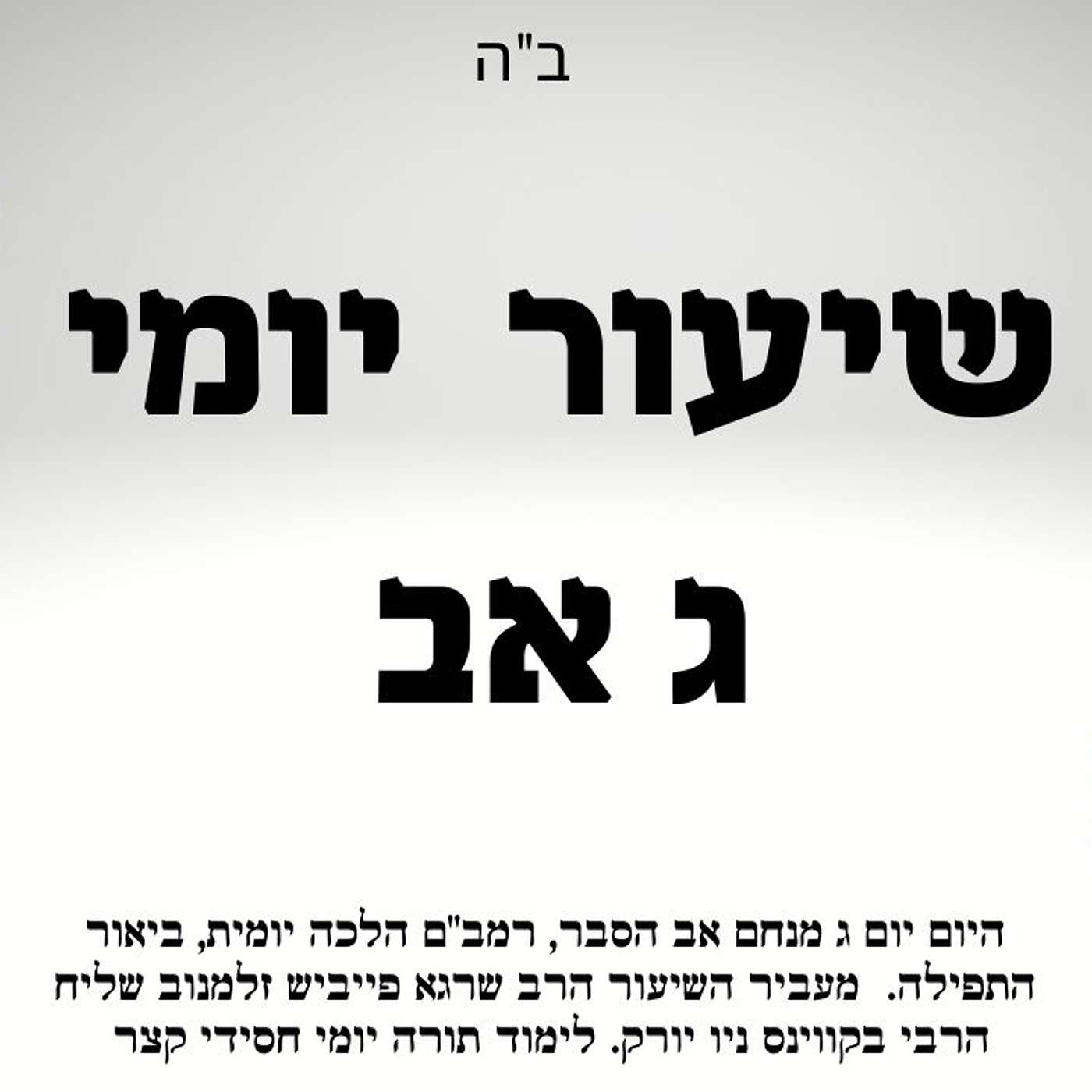 היום יום ג מנחם אב עברית ואידישתרגום לעיברית: משיחות אדוני אבי מורי ורבי: אז, כשמשיח יבוא במהרה בימינו אמן, אז יתחילו להתגעגע לימי הגלות. אז יחרה מדוע לא עסקו בעבודה. אז יפנימו את גודל הכאב של העדר העבודה. כעת, בימי הגלות, העבודה היא להתכונן לביאת המשיח במהרה בימינו אמן.היום יום ג אב במקור באידיש: משיחות אדוני אבי מורי ורבי: יעמאלט ווען משיח וועט קומען במהרה בימינו אמן וועט מען ערשט ביינקען נאך די גלות טעג. יעמאלט וועט ערשט פארדריסען פאר וואס מ'האט ניט געטאן אין עבודה. מען וועט ערשט דערהערען דעם גרויסען ווייטאג פון העדר העבודה. איצטער אין די ימי הגלות, איז די ימי העבודה צו מכין זיין זיך צו ביאת המשיח במהרה בימינו אמן.לצפיה בשיעורhttps://youtu.be/OtWMxtIrRec///שיעור תורה יום יומי וחסידי קצר הכולל חסידות, הלכה ופירושי התפילה עם הרב שרגא פייביש זלמנוב שליח הרבי מליובאוויטש לקווינס ניו יורק יסביר שלושה נושאים בקצרה: מתחילים בביאורים והסברים על ספר היום יום ג באב בעיברית, הלכות בקצרה מהרמב"ם ,ביאור והסברים על תפילת שחרית#היום_יום#שיעור_יומי#רמבם#חסידותהרשמו לזריקת חסידות בערוצים השוניםלומדים יהדות וחסידות ברשת, הרשמו לערוץ היוטיוב, פייסבוק, ווצאפ ,פודקאסטים ועודhttps://heb.centernyc.com/zrikatג אב ביאור היום יום בעיברית, רמב"ם הלכה יומית 🙌 ביאור התפילה. שיעור תורה יומי חסידות הלכה ותפילההרשמו לזריקת חסידות בערוצים השוניםלומדים יהדות וחסידות ברשת, הרשמו לערוץ היוטיוב, פייסבוק, ווצאפ ,פודקאסטים ועודhttps://heb.centernyc.com/zrikat