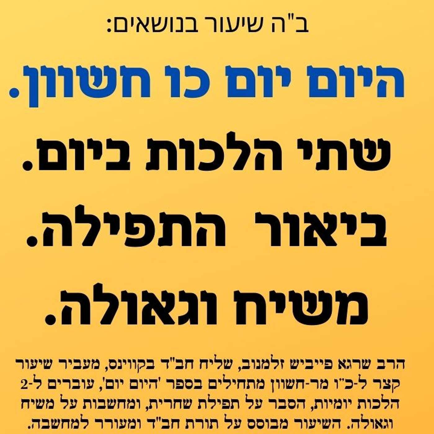 הצטרפו אלינו לשיעור מיוחד בספר "היום יום" ליום כ"ו מר-חשוון עם הרב שרגא פייביש זלמנוב, שליח חב"ד בניו יורק!בסרטון זה, הרב זלמנוב, שליח חב"ד בקווינס, ניו יורק, יוביל אתכם למסע רוחני קצר ומעצים הכולל:היום יוםהתבוננות מעמיקה בקטע היומי מתוך ספר היום יום ליום כו מר חשוון, עם תובנות מעשיות לחיים.הלכה למעשהלימוד שתי הלכות יומיות, בדגש על יישום ההלכה בחיי היום-יום.ביאורי תפילההעמקה בתפילת שחרית, עם הסברים שמעניקים לתפילה משמעות חדשה ומחוברת יותר.משיח וגאולהדיון על הגאולה העתידית ותפקידנו בהכנת העולם לבוא המשיח.השיעור מתאים לכל הרמות ומציע השראה, ידע והבנה מעמיקה בנושאי יהדות וחסידות. אל תחמיצו את ההזדמנות להתחזק ולהתעלות רוחנית!המקור ספר היום יום כו חשוון:הדרך האמיתי הוא שצריכים לדעת מהות עצמו, בהכרה אמיתית בחסרונות עצמו ובמעלות עצמו. וכאשר יודעים את החסרונות לתקנם בעבודה בפועל, ולא לצאת ידי חובתו באנחות בלבד.לצפייה בשיעור4Khttps://youtu.be/mYyFnQb3ahw/\/\רוצים להעמיק עוד יותר?הצטרפו לשיעורים שלנו בפודקאסטים, ביוטיוב ובקבוצות הווטסאפ והפייסבוק של "זריקת חסידות". בכל שיעור בספר היום יום נשוחח על פרשנויות, נלמד ונפתח דיונים מרתקים שיעזרו לכם להכניס את חוכמת היום יום המבואר לתוך חיי היומיום שלכם.הצטרפו לקבוצת ה-מה נשמע \ וואצאפ פייסבוק טלגרם וכו https://heb.centernyc.com/zrikatאנא שתפו והצטרפו לזריקת חסידות 🔥מה מחכה לכם בשיעורים?הדרכה יומיומית מתוך ספר היום יוםבכל שיעור נלמד קטעים קצרים מתוך ספר היום יום ו-היום יום המבואר, הכוללים אמרות, עצות והכוונות מעשיות בנושאים כמו עבודת ה', תיקון המידות והתמודדות עם אתגרי החיים.עומק חסידי עם היום יום המבוארנצלול לתוך עומקה של החכמה החסידית באמצעות היום יום המבואר, המעניק הבנה רחבה יותר והכוונה מעשית ליישום התובנות בחיי היומיום.לוח שנה חסידי מתוך שיעור בספר היום יוםנלמד על אירועים מרכזיים בלוח השנה החסידי כפי שהם מופיעים בספר היום יום, כולל ימי הולדת והסתלקות של צדיקים, ומועדים מיוחדים שמחזקים את החיבור למסורת.למה כדאי לכם להצטרף?חיזוק יומיומי מתוך שיעור בספר היום יוםקבלו כלים מעשיים להתבוננות יומיומית, השראה והכוונה מתוך לימוד קטעים נבחרים בספר היום יום.העמקה בעבודת ה' עם היום יום המבוארתפתחו את הקשר שלכם עם עבודת ה' דרך תכנים חסידיים והלכתיים, בהשראת הפירושים וההסברים של היום יום המבואר.חיבור למסורת מתוך היום יום בעבריתהעמיקו את הידע שלכם במנהגים, דמויות ואירועים חשובים כפי שמובאים בהיום יום בעברית.✨ מצוה להפיץ! 📲תָּנָא דְּבֵי אֵלִיָּהוּ זָכוּר לְטוֹב:כֹּל הַשּׁוֹנֶה הֲלָכוֹת בְּכֹל יוֹם - מֻבְטָח לוֹ שֶׁהוּא בֶן הָעוֹלָם הַבָּא!#היום_יום#שיעור_יומי#הלכה_למעשה#הלכות#חסידות#שתי_הלכות#שיעור#תורה#חבד#הרב_שרגא_זלמנוב#תפילה #ביאור_התפילה#היוםיום#שיעור_חסידות #הלכה #משיח #גאולההרשמו לזריקת חסידות בערוצים השוניםלומדים יהדות וחסידות ברשת, הרשמו לערוץ היוטיוב, פייסבוק, ווצאפ ,פודקאסטים ועודhttps://heb.centernyc.com/zrikat