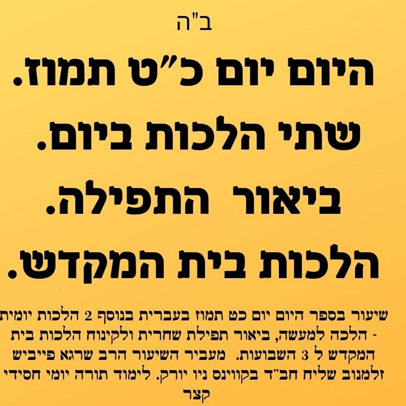 שיעור חסידות קצר ליום כט תמוז בשיעור הרב שרגא פייביש זלמנוב שליח חב"ד בקווינס ניו יורק יעבור על 4 נושאים בקצרה:1. שיעור בספר היום יום בעברית כ"ט תמוז בעברית2 שתי הלכות ביום - הלכה יומית למעשה - הלכות 9 הימים3. ביאור התפילה - תפילת שחרית - ביאור פסוקי דזמרה4. הלכות בית המקדש לכבוד 3 השבועות.לצפייה בשיעור 4Khttps://youtu.be/6BOem1oqSFwהספר "היום יום" הוא אוסף מאמרים יומיים שנכתבו על ידי הרבי מנחם מנדל שניאורסון, האדמו"ר השביעי של חסידות חב"ד, בהנחייתו של הרבי יוסף יצחק שניאורסון, האדמו"ר השישי של חב"ד. הספר הודפס לראשונה בשנת תש"ג (1943) ומאז נחשב לאחד הספרים המרכזיים והמשמעותיים ביותר בחסידות חב"ד.הספר "היום יום" מורכב מקטעים קצרים, אחד לכל יום בשנה, המשלבים אמרות חוכמה, הדרכות בעבודת השם, עצות לחיים והשראה רוחנית. מטרתו של הספר היא לספק מקור יומיומי של התעוררות והכוונה בעבודת השם, הן לחסידי חב"ד והן לכל אדם המעוניין להעמיק בעבודתו הרוחנית ובקשר שלו עם הקב"ה.בנוסף לקטעי ההשראה היומיים, הספר מכיל גם לוח שנה חסידי הכולל תאריכים חשובים וימי זיכרון בחסידות חב"ד. כך, הספר משמש כמקור ידע והכוונה בנוגע לאירועים ותאריכים מרכזיים בחיי החסידות.אנו מזמינים אתכם להצטרף לשיעורים בפודקסט וביוטיוב של "זריקת חסידות", שם אנו מעמיקים ומבארים את תוכני הספר "היום יום" ומספקים פרשנויות והסברים מעמיקים יותר. השיעורים שלנו מספקים הזדמנות ייחודית ללמוד ולהבין את המסרים העמוקים של הספר, ולהתחבר אליהם בחיי היומיום.להצטרפותhttps://heb.centernyc.com/zrikatבואו והצטרפו אלינו למסע רוחני מעשיר ומחזק!המקור ספר היום יום כט תמוז:מצאו פתק בכתב-יד-קודש הצמח צדק ותוכנו, שהחליט ללמוד בכל יום שש שעות בלילה בעמידה נגלה, ותודה-לאל שקיים ועבר על ש"ס בבלי וירושלמי וארבעה חלקי שולחן ערוך בעיון.✨ מצוה להפיץ! 📲תָּנָא דְּבֵי אֵלִיָּהוּ זָכוּר לְטוֹב:כֹּל הַשּׁוֹנֶה הֲלָכוֹת בְּכֹל יוֹם - מֻבְטָח לוֹ שֶׁהוּא בֶן הָעוֹלָם הַבָּא!אנא שתפו והצטרפו לזריקת חסידות 🔥לומדים יהדות וחסידות ברשת ותפילות במקומות הקדושים, הרשמו לערוץ היוטיוב, פייסבוק, ווצאפ (קבוצה שקטה), טלגרם, פודקאסטים ועוד:https://heb.centernyc.com/zrikatוהישארו מעודכנים#היום_יום#שיעור_יומי#הלכה_למעשה#הלכות#חסידות#שתי_הלכות#שיעור#תורה#חבד#הרב_שרגא_זלמנוב#תפילה #ביאור_התפילההרשמו לזריקת חסידות בערוצים השוניםלומדים יהדות וחסידות ברשת, הרשמו לערוץ היוטיוב, פייסבוק, ווצאפ ,פודקאסטים ועודhttps://heb.centernyc.com/zrikat
